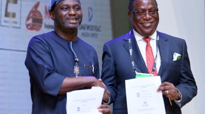 The chief executives of Nigerian Content Development Board Felis Omatsola and that of the Bank of Industry, Dr. Olasupo Olusi, displaying the documents for the implementation of the $100 million equity funds for local content development