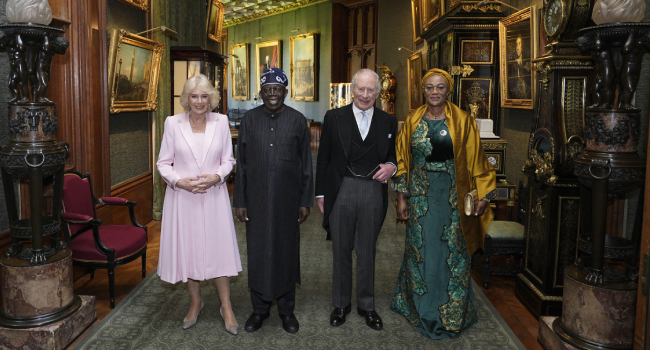 Britain’s King Charles III and Nigeria’s President Bola Tinubu stand with their wives Britain’s Queen Camilla (L) and Nigeria’s First Lady Oluremi Tinubu as they pose for a photograph in the Grand Corridor, during an audience at Windsor Castle, in Windsor, on March 18, 2026, on the first day of a two-day State Visit to the United Kingdom by Nigeria’s President. (Photo by Aaron Chown / POOL / AFP)